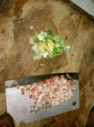 猪肉切丁、葱姜蒜切丁