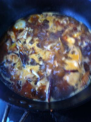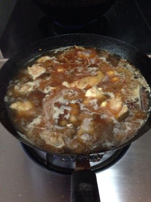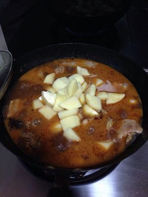加入土豆块,放一点生抽、老干妈、还有豆瓣酱,盖上盖子继续煮,豆瓣酱我用的不是郫县豆瓣酱,是朋友从四川带给我的一种颜色比较黑的酱,比郫县好吃