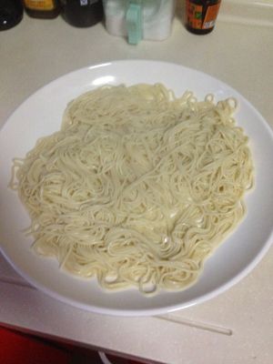 煮一点面条,用湿面条比干面条有劲道,刀削面、扯面都可以!看自己喜欢!煮好的面条捞出来摆在盘子上,一定要大盘子,越大越好!我在淘宝上买的,跟饭店里吃剁椒鱼头的盘子那么大