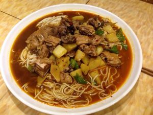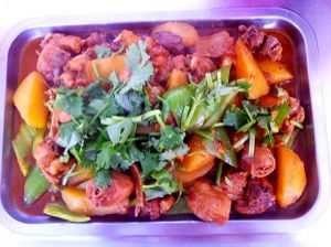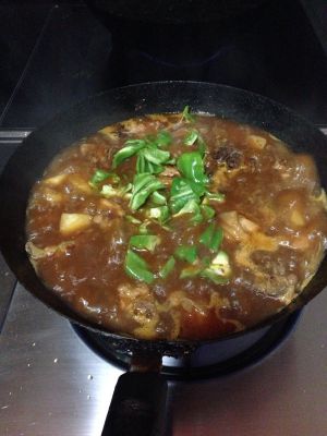 倒入土豆块,放十三香、老干妈。、酱油、盐、各种大料磨成的调料粉(卖调料的地方会磨好零售),不断翻炒15分钟左右。