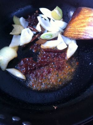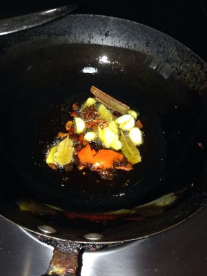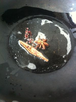 锅中放油,依次下八角桂皮花椒,翻炒几下,再放姜片,洋葱大蒜,干辣椒
