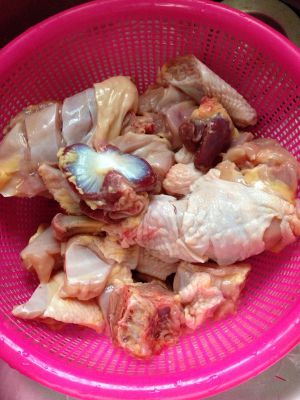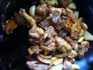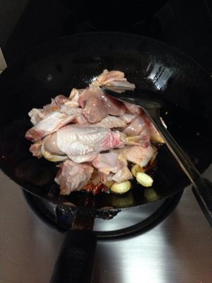 倒入适量的油,待油熟时放入花椒、葱姜蒜爆香,再将腌制好的鸡块倒入油锅中翻炒至鸡肉变黄!