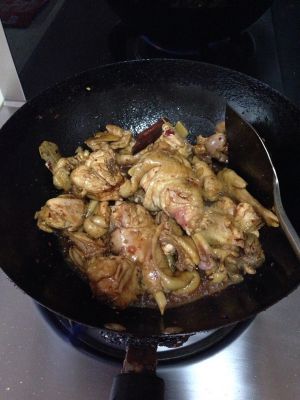 下鸡肉翻炒均匀,加酱油,蚝油,料酒,胡椒粉,十三香,糖,孜然粒,继续翻炒几下加水,水末过鸡肉,大火炖20分钟