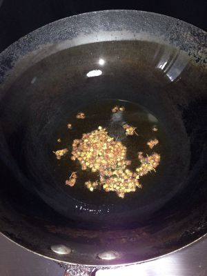 将油烧热至冒青烟后关火,过半分钟后将花椒粒放入锅内炸出香味,然后将花椒挑出来,以免吃的时候咬到花椒不爽!我用的是福临门菜籽油,个人觉得炒肉类用菜籽油很香!
