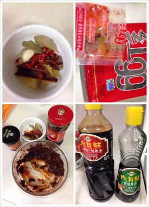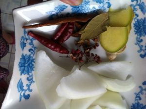 蒜瓣拍一下、老姜切片、香叶、八角、桂皮、干辣椒准备好
