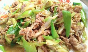 少量食用油热锅…加入羊肉片…羊肉片稍微变色后加入大葱段…片刻后加入生抽,味精和食盐…头出锅放少许香油更是香喷喷啦…