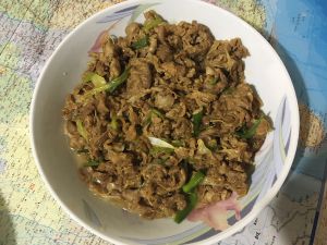 锅内少油放入一片姜,待闻到姜味倒入羊肉加少许料酒,变色后加入大葱煸炒,一点点醋、一点糖、一点鸡精、生抽适量,勾芡后稍稍搅动出锅