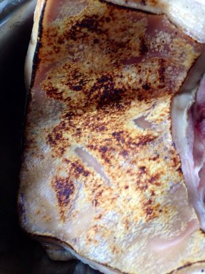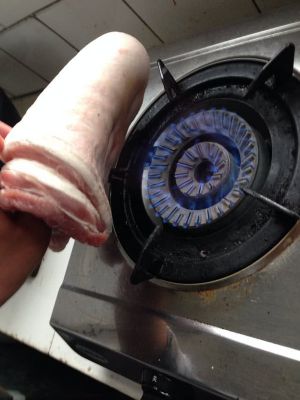 第六步:放一点油开始煎五花肉,两面煎的焦黄即可。