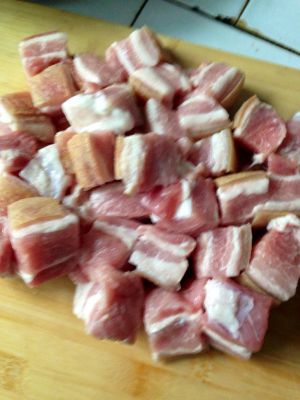 买回来的五花肉先不要切,先焯下水,焯好水的肉切成1厘米厚的方块,装盘备用。土豆也切成1厘米厚的方块,切好的土豆泡在水里,一是可以将切出来的土豆浆洗掉,二是土豆不会变颜色。