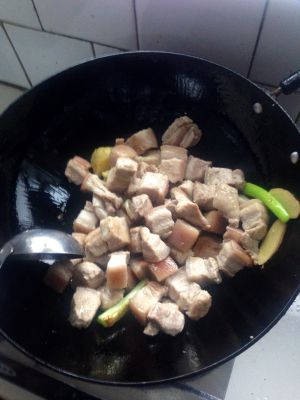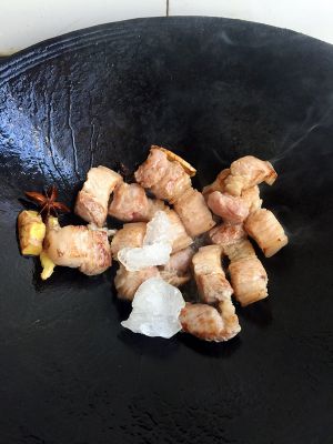 热锅凉油,待油七成热时下入五花肉,姜片和八角。