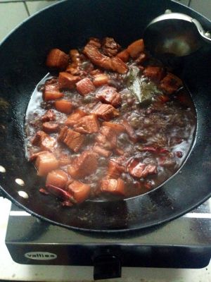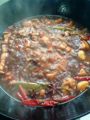 一大勺酱油炒香,加水没过肉烧开。把八角,桂皮,干辣椒,冰糖,香叶,一小勺醋,料酒,鸡精,盐,腐乳倒入锅里,大火烧开。