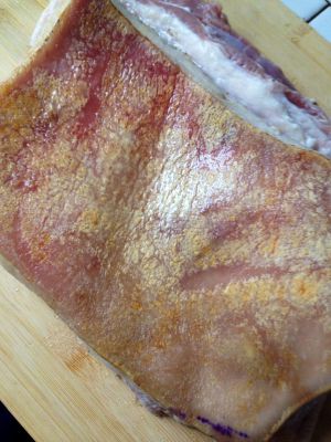 第三步:把五花肉切段连皮但不要完全切断,如图所示。