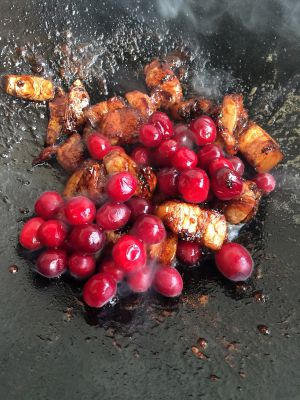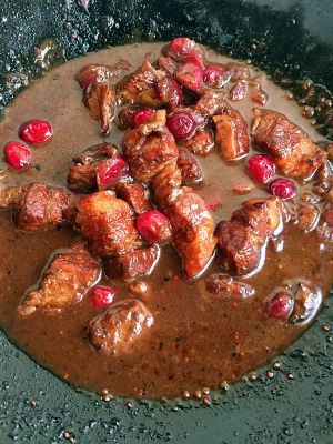 第十三步:肉出锅后,还有些汁水,可以用来煮一点点蘑菇,按个人喜好,把煮好的蘑菇放入肉中间,漂亮的摆盘就出来了。