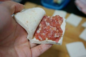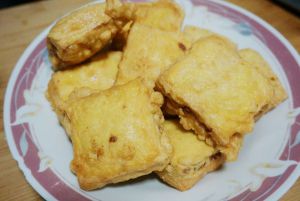 锅中放入适量的油,油六成热时,将豆腐夹裹上面糊,放入锅中,中小火炸至金黄捞出沥油。之后再复炸一次。