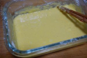 准备蛋糊。碗中打入1个全蛋和刚才没用的那个蛋黄,加入面粉和2勺淀粉和适量的水,用勺子舀起来能缓慢流下的状态。