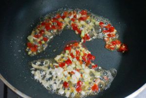 锅中留少许底油,放入姜末,蒜末和泡椒末炒香。