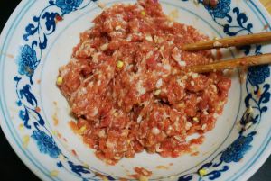 肉馅中加入葱姜蒜末,蚝油,盐,生抽搅匀,再打入一个蛋清,搅匀。