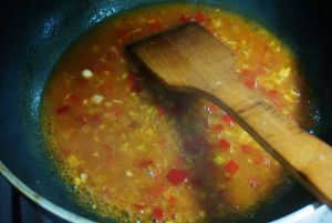 鱼香肉丝料、糖、盐、番茄酱加适量水翻炒至沸腾