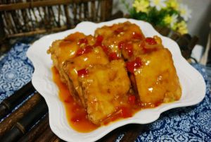 酸甜口调好,把配料炒熟,把豆腐放进去,要多放点汤,把豆腐放进去之后不要翻动,用小火炖一会,炖的同时用产子把底产一下,但是不要翻动!