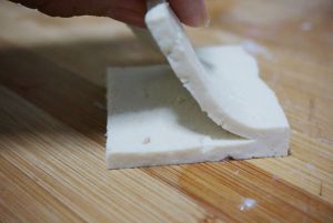 我用的是我们东北的豆腐,比南方的豆腐要厚,切成片,不要太薄!