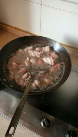 将飞水的五花肉块放入锅里,小火慢慢加热