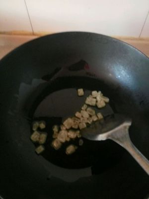 将肉铲到一边,放入葱白姜片和大蒜爆香