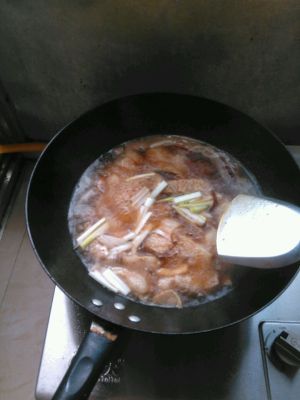 肉汤烧开后撒入葱丝,倒入适量红烧酱油,翻搅让肉块均匀吸收。
