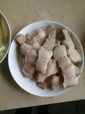 将买来的五花肉切成5厘米左右的肉块儿,凉水下锅开大火煮沸后2分钟捞出,用温水冲去浮沫沥干水分待用。