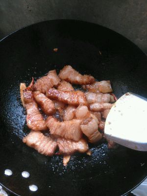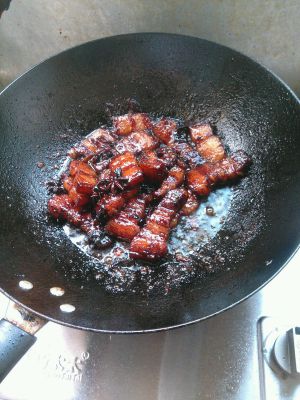 另起锅,放一点油,爆香蒜片、姜片、干辣椒、桂皮、大料,放入沥干水分的五花肉,待肉稍微变黄上色倒入酱油和少于白糖,整瓶黄酒入锅