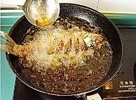 然后把鱼顺锅边划入油锅内,边炸边向鱼身上浇热油,中火炸至鱼皮变酥。