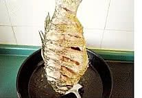 锅里放入足量的油,烧至7成热,手提鱼尾,在锅上用勺往鱼身上淋热油,使鱼定型。