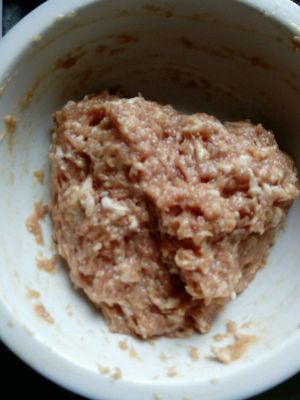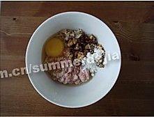这个肉是七分瘦加三分肥的,剁成肉末后,加淀粉,加葱头碎,盐,酱油,搅拌就可以准备下一个步骤