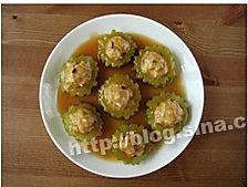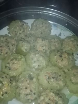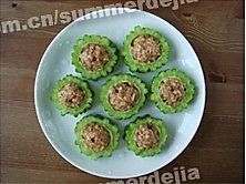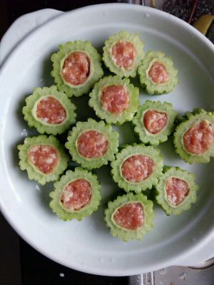 把肉馅酿入苦瓜中,上锅蒸约十分钟;