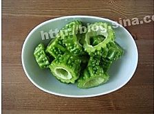 苦瓜洗净切块,中间去籽,烧一锅热水,水开下苦瓜块,水再次开煮一分钟捞出锅,浸泡冷水中备用