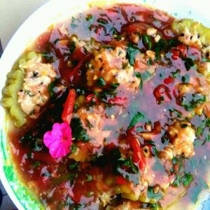 蒸好后的盘子里有汤汁,倒出来后,放炒锅里,煮开后加入水淀粉,盐酱油,搅拌均匀,开了后里面淋在苦瓜酿肉上