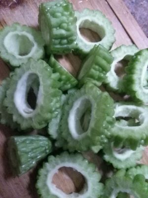 苦瓜切段,六七公分宽度,泡盐水,去苦味,或者放入开水中汆一下