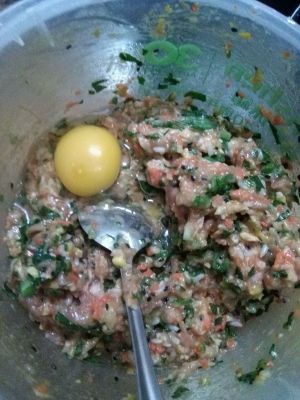 肉末加鸡蛋,芹菜,胡萝卜,盐,味精,料酒调味