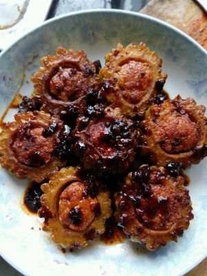 将豆豉切碎,待苦瓜煎至半熟食加豆豉生抽染色调味,再淋上少许水,盖上锅盖,闷5~10分钟,即可出锅