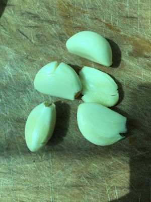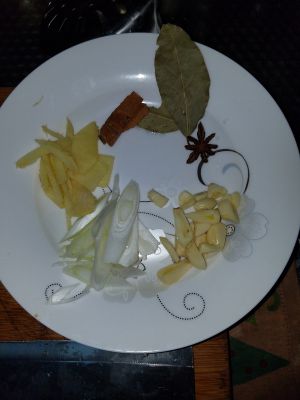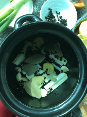 在砂锅底铺上大葱段、姜片、大蒜、香叶、木瓜籽。(香叶3片即可,木瓜籽也不要放过多)