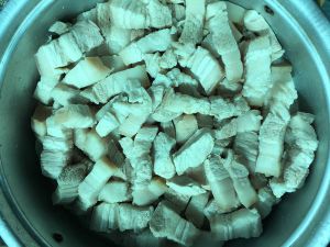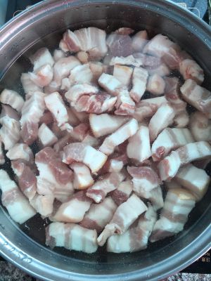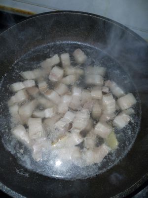 我买了2斤五花肉切块(可让卖肉的商家给切好)我家人多,做的多!放入凉水中焯一下