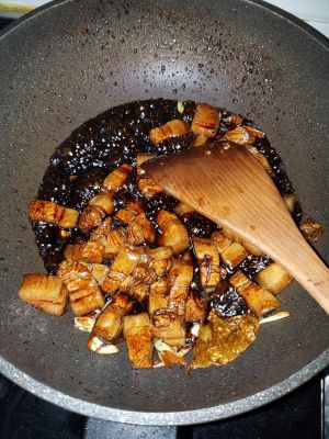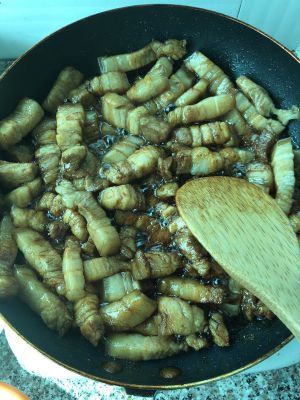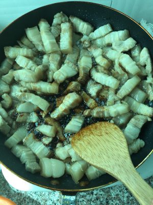 糖全部溶于肉中后,放入适量酱油翻炒均匀上色