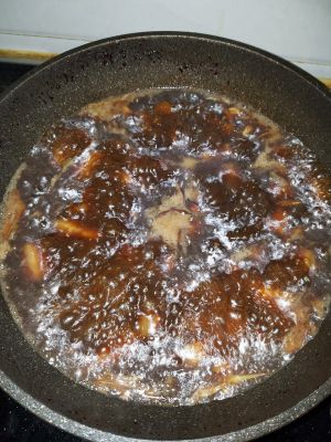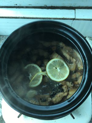 大火烧开后放入柠檬切片,改小火炖!约半小时可以加入适量盐和酱油,继续炖,直到水份几乎烧没。