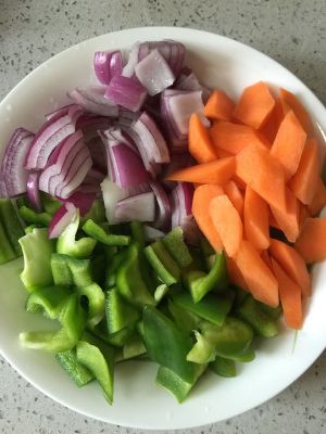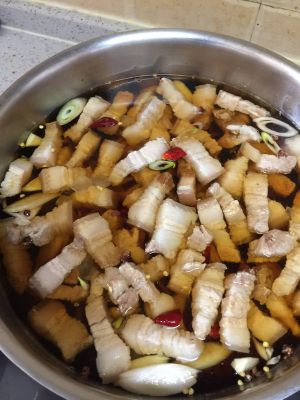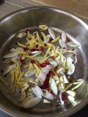 炒的有些变色,表面微熟,加水,放葱,姜,花,大料,盐,味精