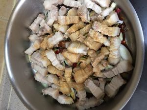 3. 炒锅内放水加入姜片,下入五花肉煮沸后捞出用热水洗净备用。