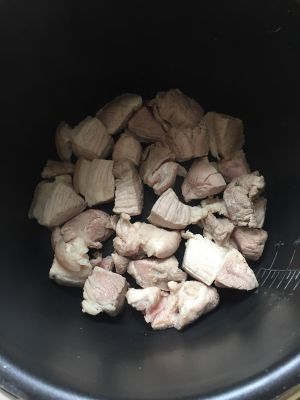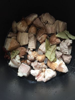 放入高压锅加入炸好的肉,加入料酒 倒入炒好的糖水 水添加至没过肉 放入姜片蒜 酱油。盖上锅盖吹制10分钟。