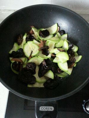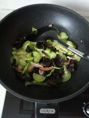把翻炒好的黑木耳和香菇一起放锅里,锅里加一点热水,盖上锅盖,把西葫芦闷软。此处若加了肉片会变老。