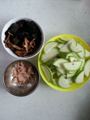 第一步,准备工作。干黑木耳和香菇提前泡发,洗干净后,黑木耳撕小块,香菇切厚片。肉片放少许盐,黄酒,淀粉抓匀,这部是为了使肉片嫩嫩的。西葫芦切片。