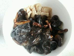 起油锅,先煸炒肉片,发白就可以盛出了。再放入黑木耳和香菇,翻炒一会,盛出备用。