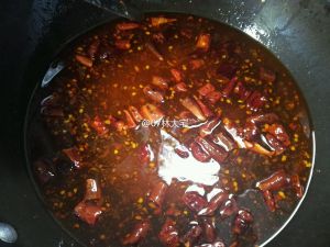 倒油,放入干辣椒,花椒炒一下,不要炒太久,要不会糊了;然后倒入姜,蒜头,鲜辣椒,葱段,还有两勺子的郫县豆瓣酱翻炒几下