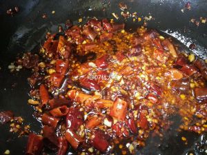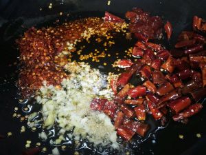 余下的油继续热着,入姜蒜、干辣椒、辣椒面、郫县豆瓣酱,煸炒,烧出红油.
